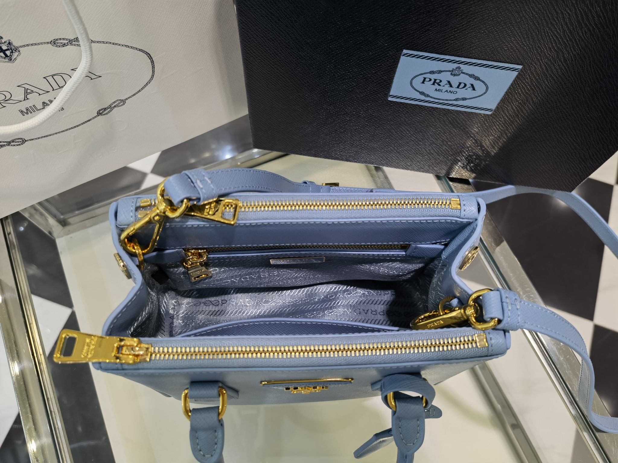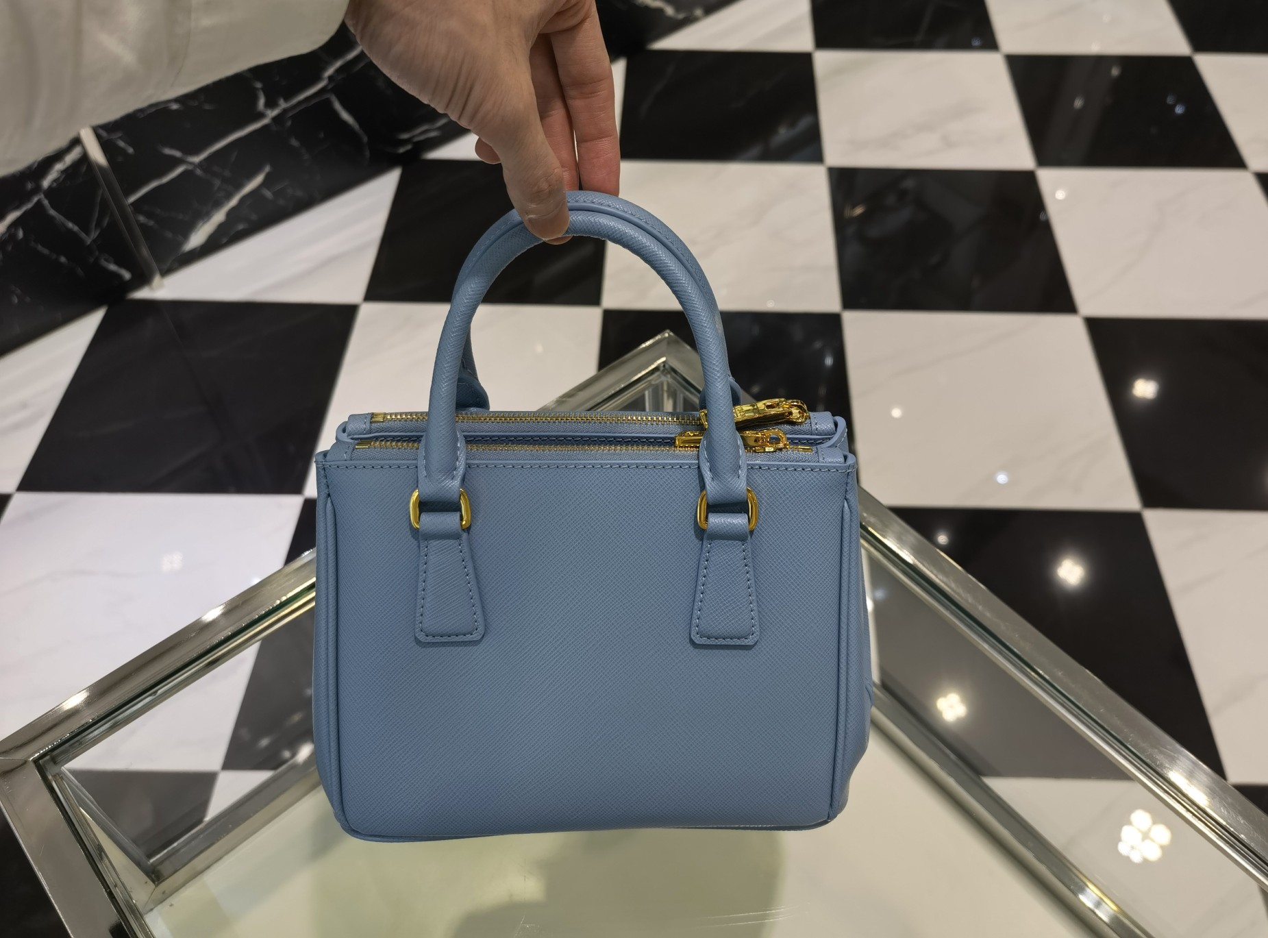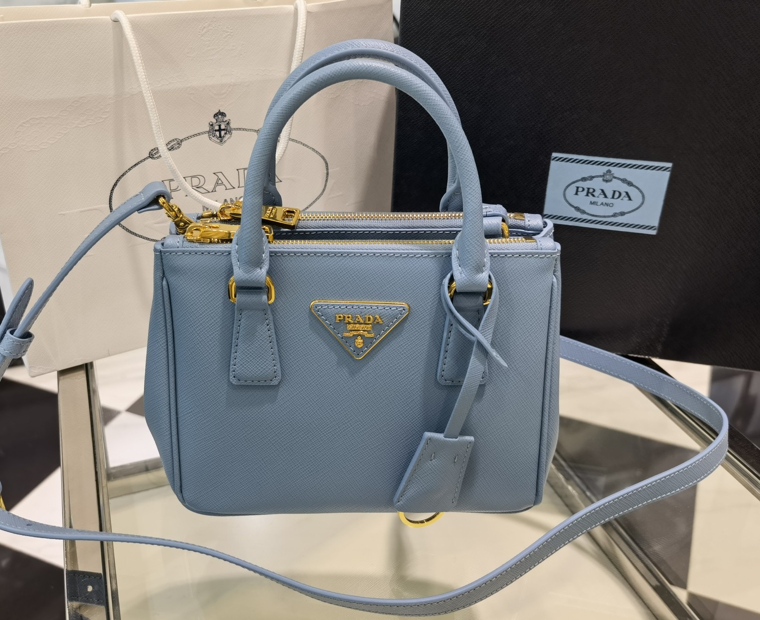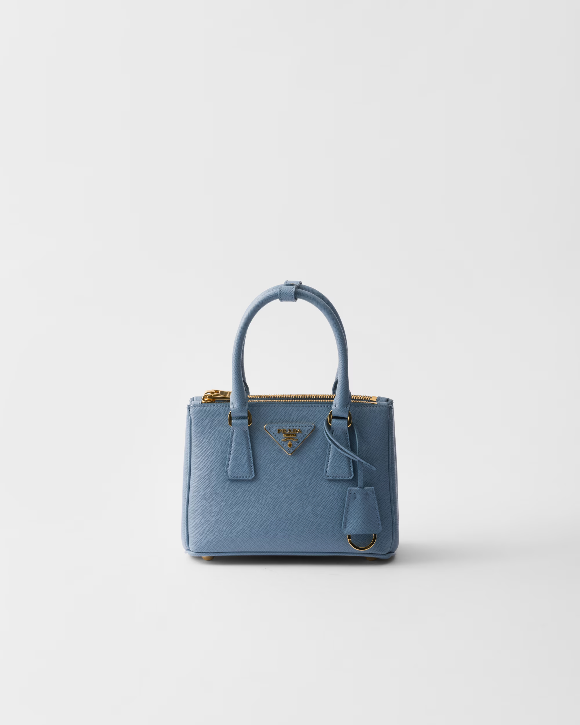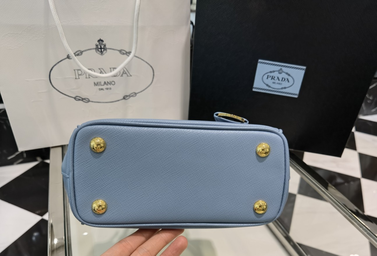 This is a replica Prada Galleria 1BA906 Saffiano leather mini-bag. ,Leather handles,Detachable, adjustable leather shoulder strap. Max. length: 120 cm – Min. length: 110 cm – Max. drop length: 60 cm – Min. drop length: 55 cm,Removable leather key ring,External zipper pockets,Metal hardware,Leather triangle with metal lettering logo on the front,Snap closure on the sides,Logo-print nylon lining with two pockets, including one with zipper,With purse feet,Height: 14.5cm,Width: 20cm,Length: 9.5cm