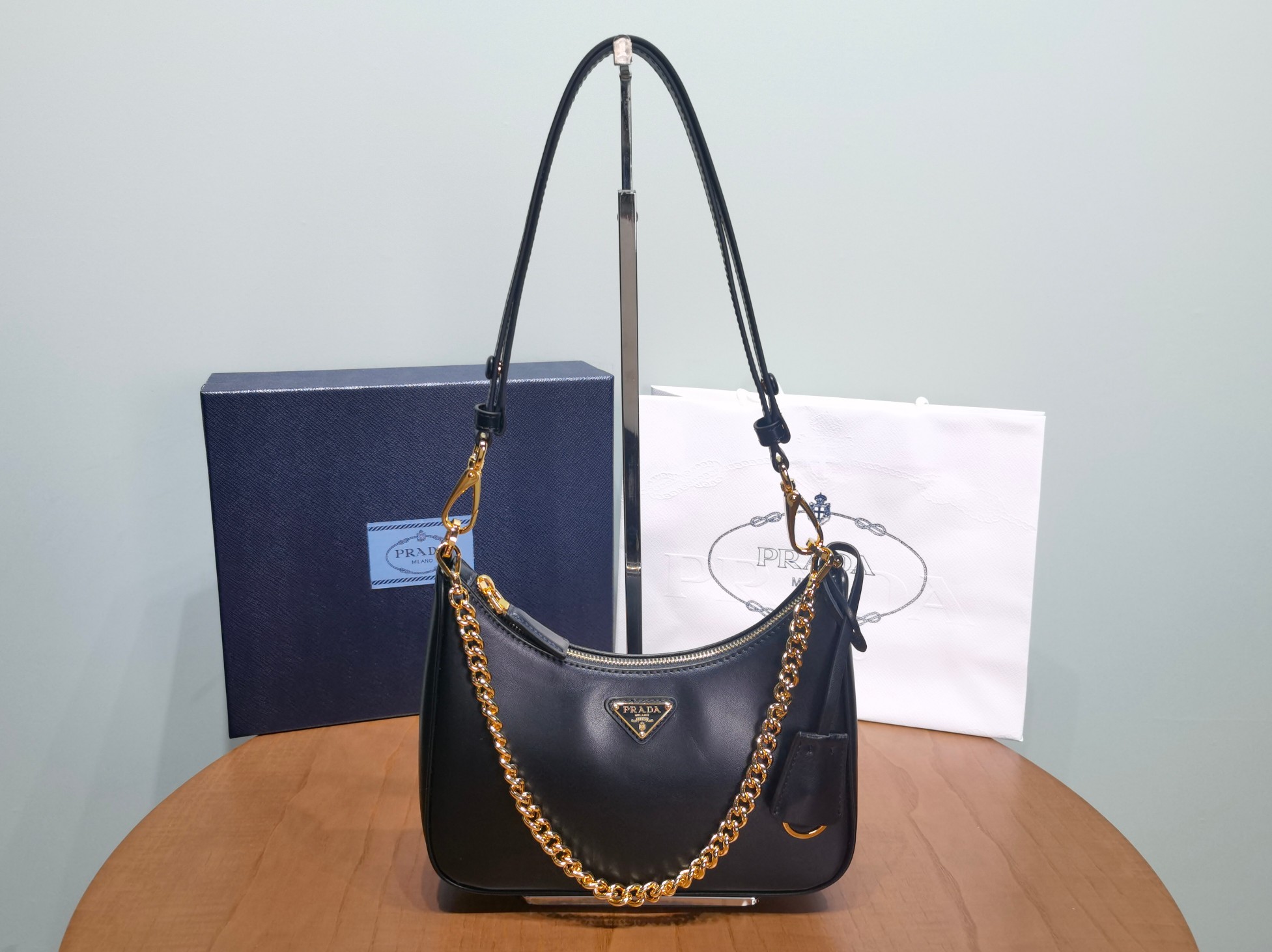 This is a replica Prada Re-Edition 1BC204 leather mini-bag. ,Detachable, adjustable chain and leather handle,Removable leather key ring,Metal hardware,Enameled metal triangle logo on the front,Zipper closure,Logo-print nylon lining,Height: 18cm,Width: 22cm,Length: 6cm