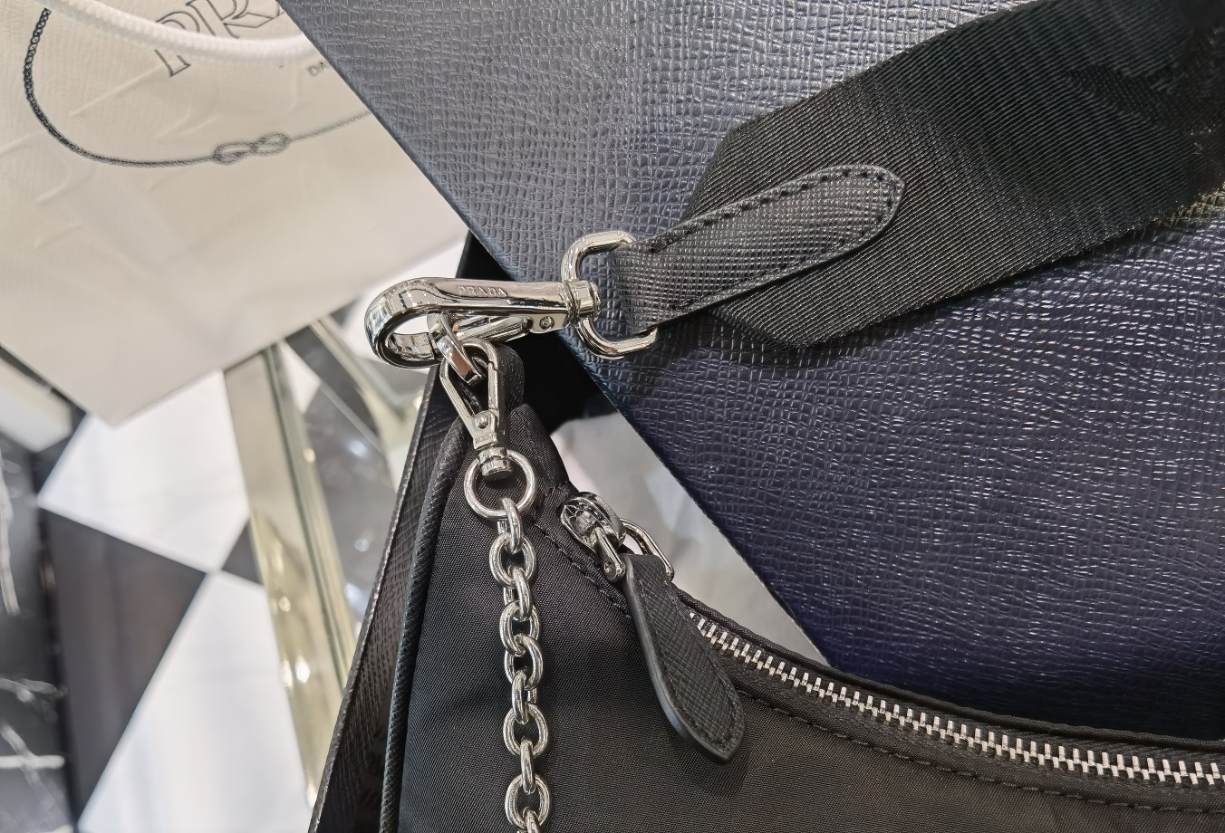 This is a replica Prada Re-Edition 1BH204 2005 Re-Nylon bag. ,Saffiano trim,Removable chain handle,Detachable adjustable 85 cm logo-print woven nylon shoulder strap,Removable Re-Nylon zipper pouch with Re-Edition keychain,Metal hardware,Enameled metal triangle logo on the front,Zipper closure,Re-Nylon logo lining,Height: 18cm,Width: 22cm,Length: 6cm