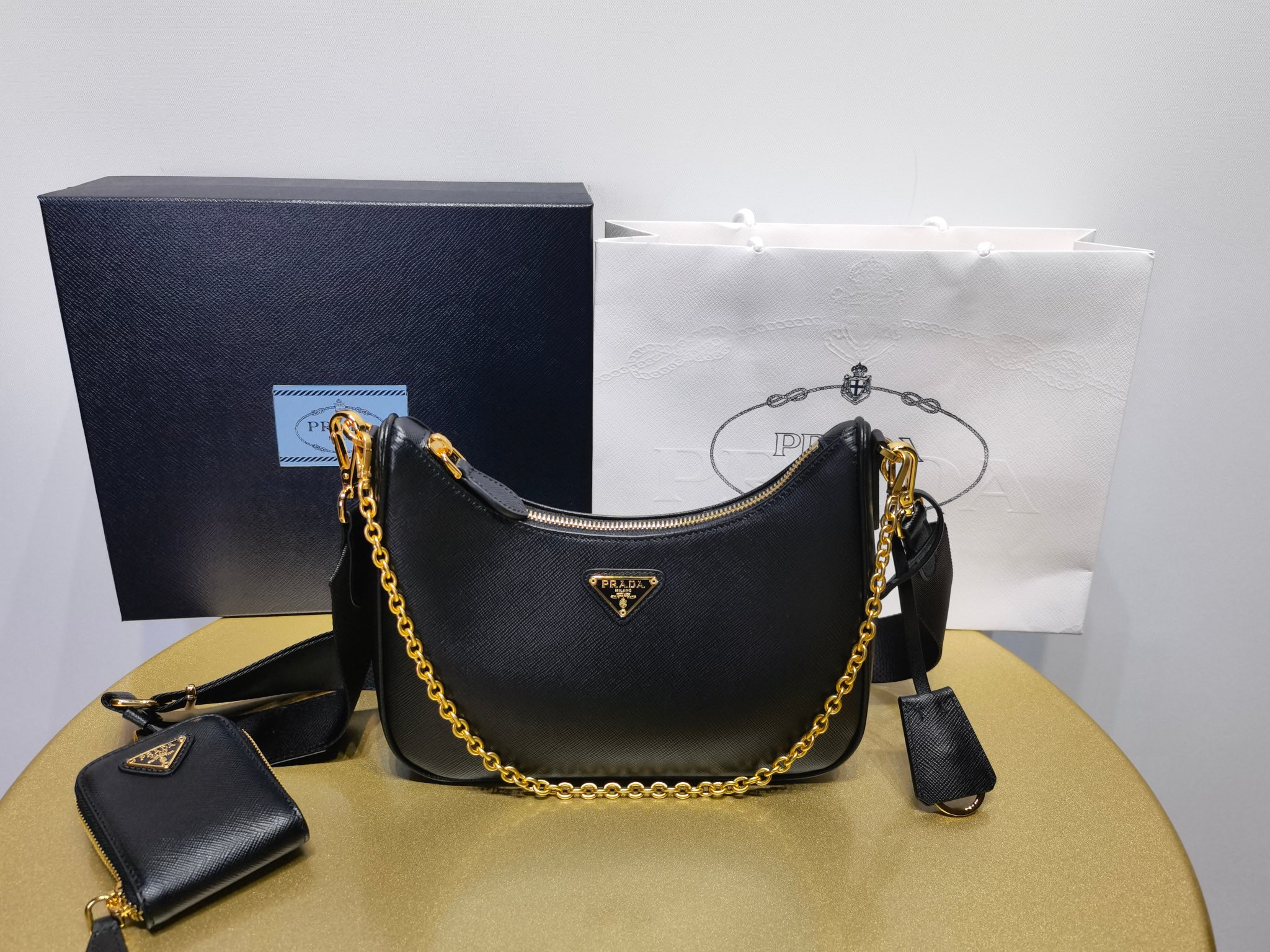 This is a replica Prada Re-Edition 1BH204 2005 Saffiano leather bag. ,Saffiano leather,Detachable chain handle,Detachable adjustable 85 cm logo-print woven nylon shoulder strap,Detachable leather pouch with zipper closure and Re-Edition keychain,Metal hardware,Enameled metal triangle logo on the front,Zipper closure,Prada logo nylon lining,Height: 18cm,Width: 22cm,Length: 6cm