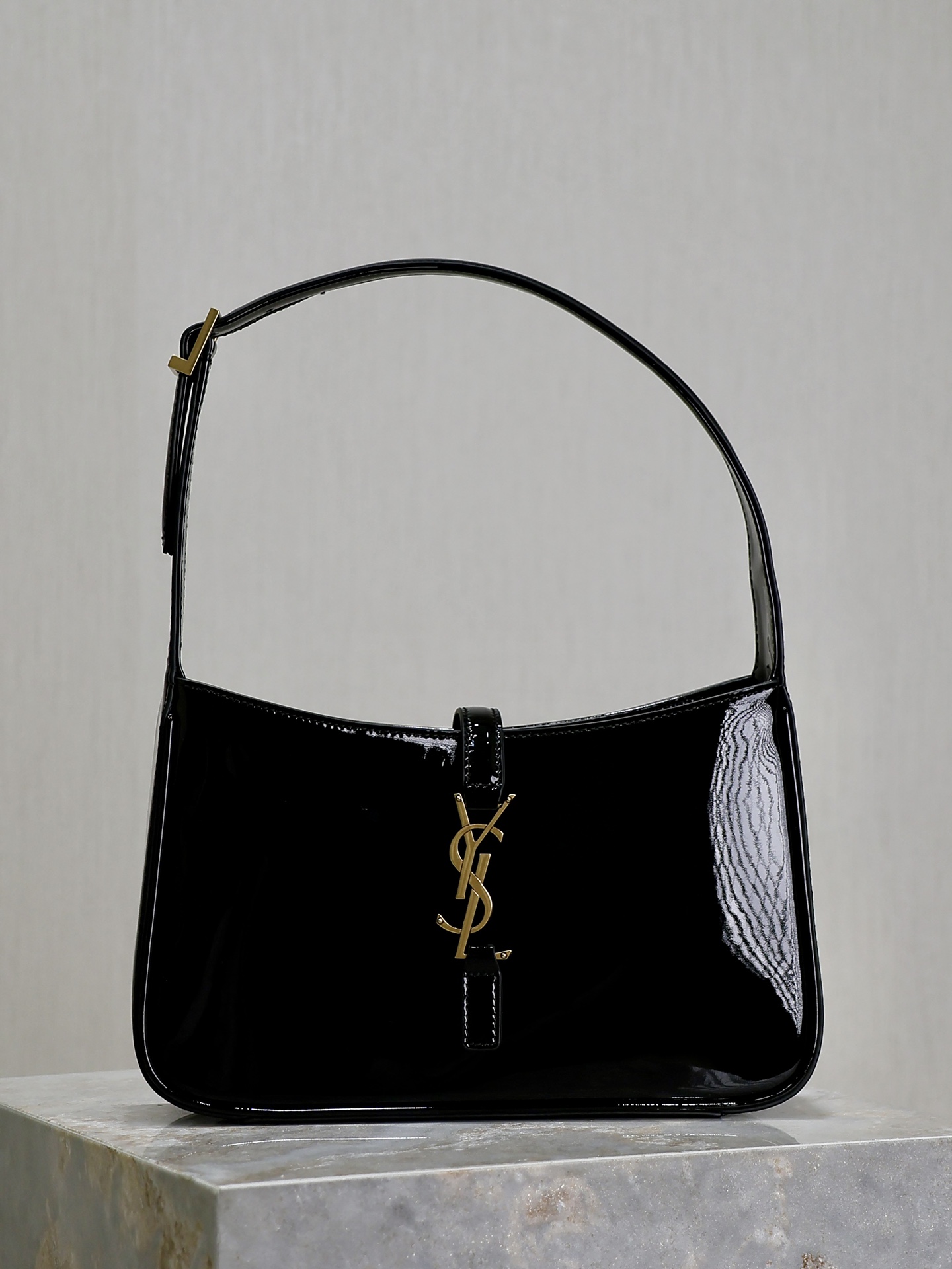 This is an replica SAINT LAURENT Le 5 À 7 in patent leather.,Hobo bag with an adjustable strap and CASSANDRE hook closure.,